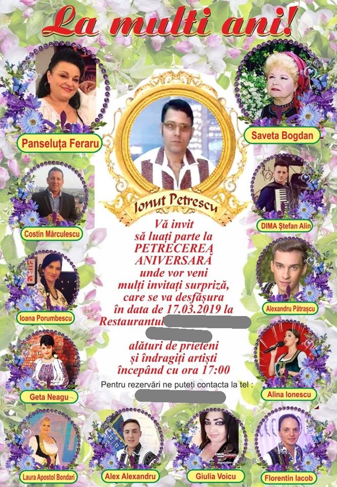 Cu ocazia aniversării zilei mele de naștere, am deosebita plăcere să am alături oameni dragi sufletului meu, fapt pentru care voi fi onorat să petrec cu voi acest eveniment important din viața mea. Vă invit să sărbătorim într o atmosferă caldă oferită de mari artiști ai folclorului românesc și invitați surpriză, în data de 17.03.2019, orele 15.00, Vă aștept cu drag!”, a notat pe Facebook fiul nelegitim al lui Ion Dolănescu.
