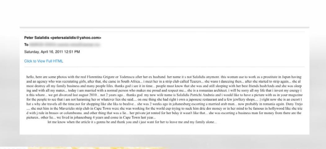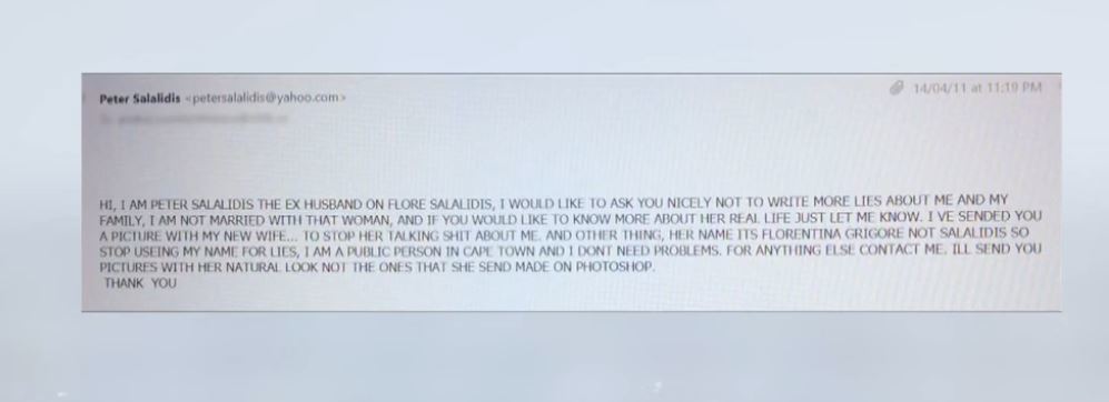 Peter Salalidis, sud africanul a carui nume de familie este disputat de fostele sotii, a fost nascut si educat in Africa de Sud si SUA. Deci o educatie solida in limba engleza, deci acele email-uri nu puteau fi scrise de el, doar de cineva care inca invata limba engleza.