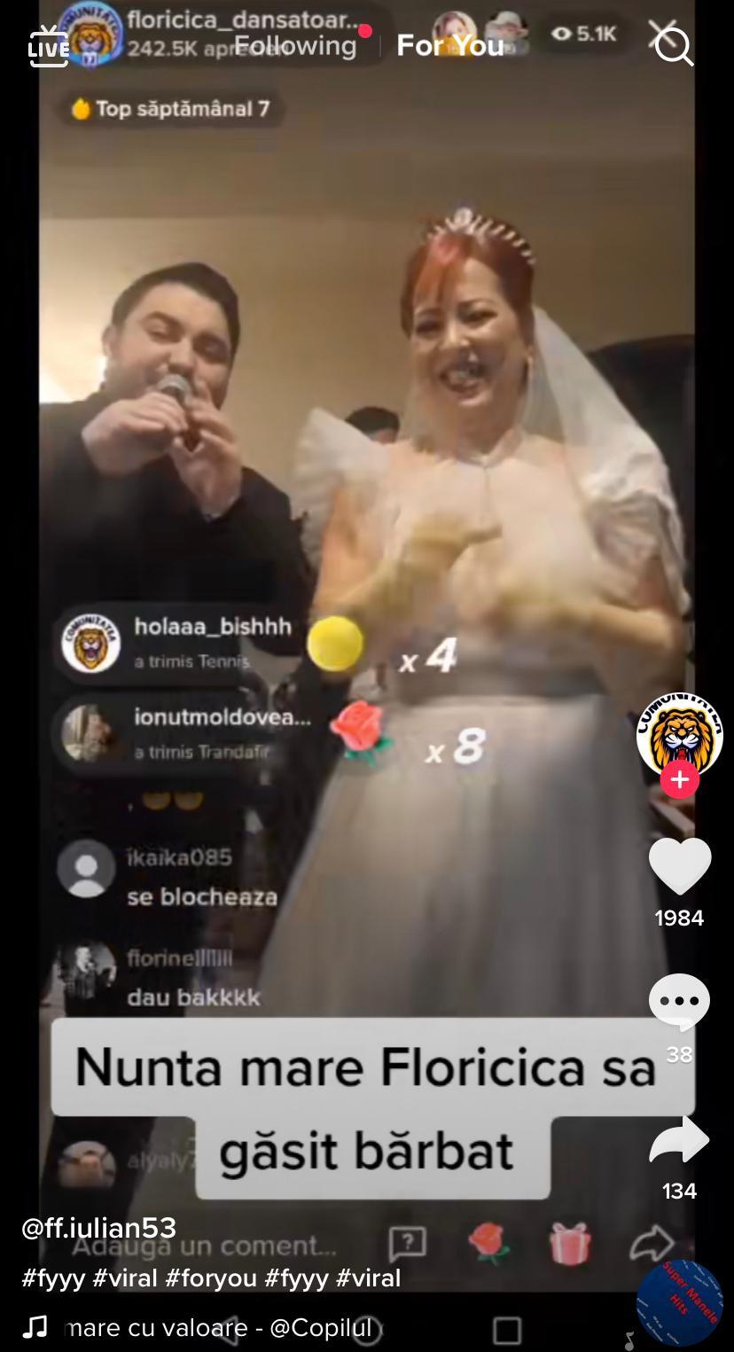 De data aceasta, Floricica Dansatoarea i-a lăsat pe toți muți de uimire, după ce a îmbrăcat rochia de mireasa, s-a aranjat, și-a pus voalul, iar mai apoi a dat drumul la live pe TikTok. Alături de un manelist, Floricica a dansat, a cântat și s-a distrat.