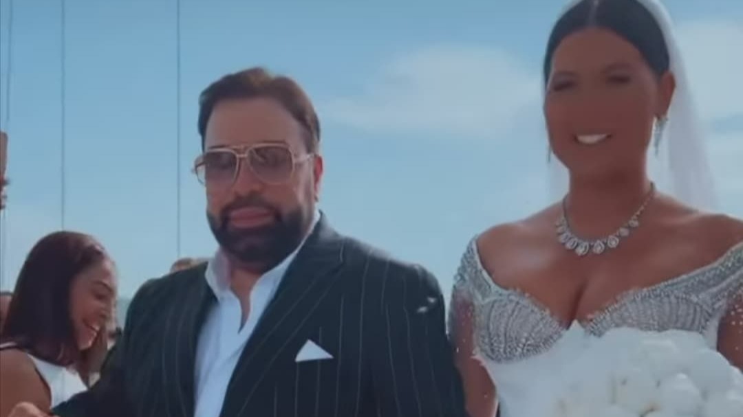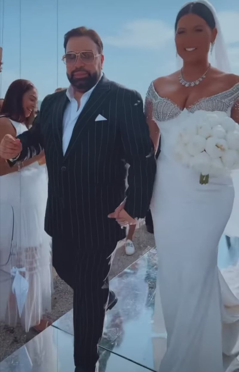 ”Regele manelelor”, așa cum se autointitulează manelistul, a îmbrăcat un costum negru, în dungi, asortat cu o cămașă albă și ochelari de soare, în timp ce mama copiilor săi a strălucit sub razele soarelui.