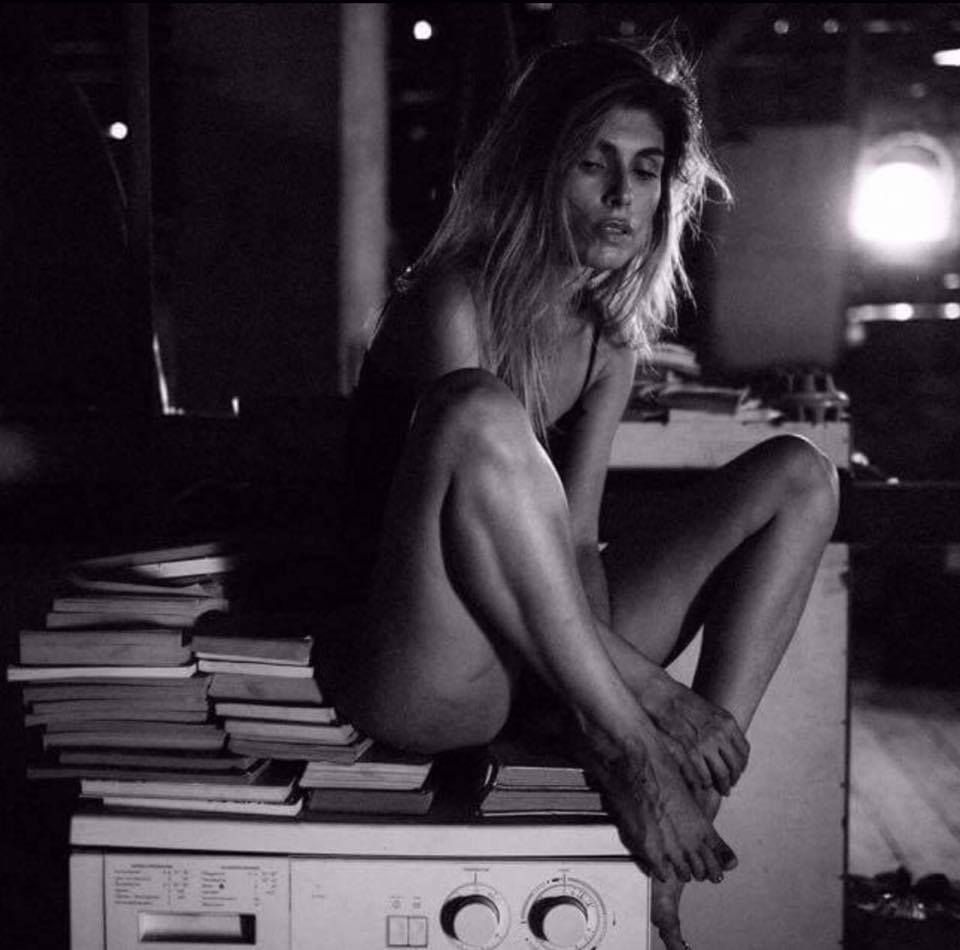Recent, Sanziana a mai facut un pas inainte si a pozat nud, in alb-negru, pe o masina de spalat. Un admirator cu simt de observatie, a comentat fotografia Sanzianei: „Pe masina de spalat sunt carti, nu rufe”.