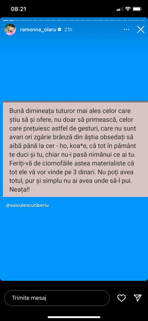 „Bună dimineața tuturor, mai ales celor care știu să și ofere, nu doar să primească, celor care prețuiesc astfel de gesturi, care nu sunt avari ori zgârie brânză din ăștia obsedați să aibă până la cer- ho, koa*e. că tot în pământ te duci și tu. Feriți-vă de ciomofăile astea materialiste că tot ele vă vor vinde pe 3 dinari. Nu poți avea totul, pur și simplu nu ai avea unde să-l pui. Neața”, a scris Ramona Olaru pe InstaStory.