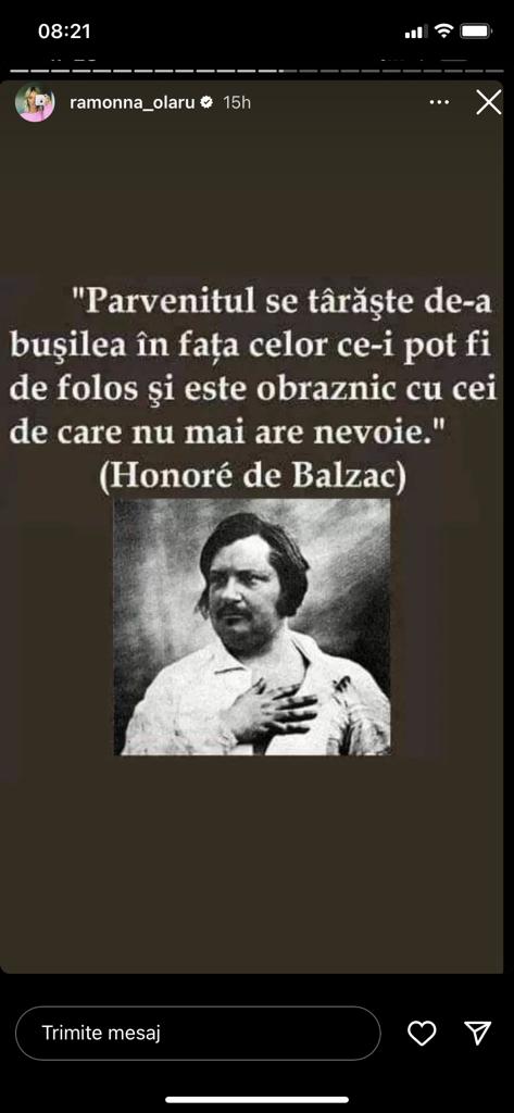 „Parvenitul se târăște de-a bușilea în fața celor ce-i pot fi de folos și este obraznic cu cei de care nu mai are nevoie”, a mai scris Ramona Olaru pe Instagram.