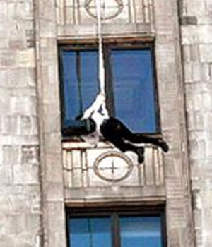 Zilele trecute, polonezii care au trecut prin fata Palatului Culturii si Stiintei din Varsovia au ramas cu gura cascata. Un barbat era atarnat de un cablu la etajul 40 al cladirii care este cea mai inalta din Polonia.