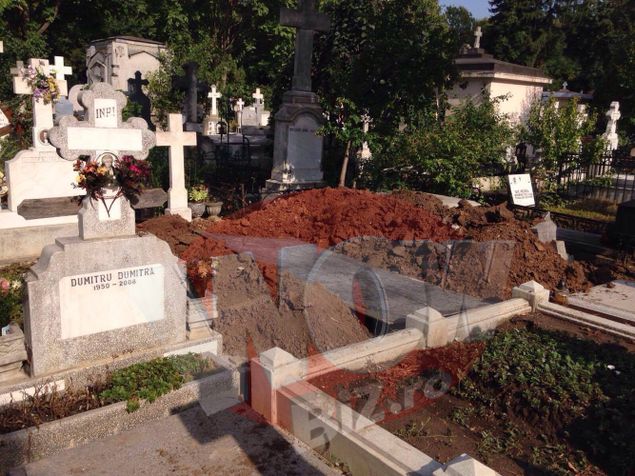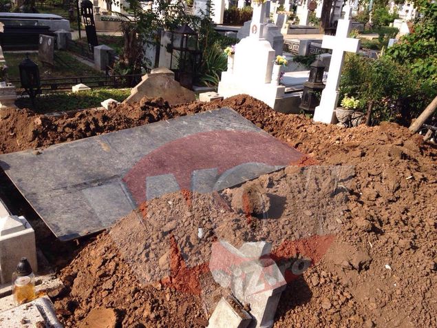 Pe bucata de cruce se mai vad numele celor care au fost ingropati acolo Monumentul vechi din piatra, spart si deteriorat era ieri dupa-amiaza inca lasat acolo, pe jumatate ingropat in pamantul scos la suprafata. Pe bucata de cruce se mai distinge chiar daca cu greu numele celor care au ocupat, inaintea actorului, respectivul loc de veci: Petre, Costica.