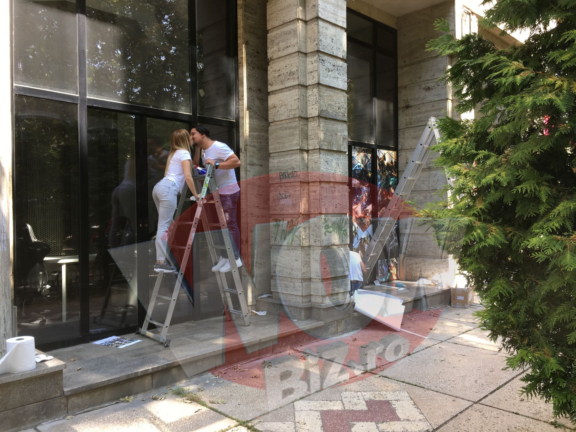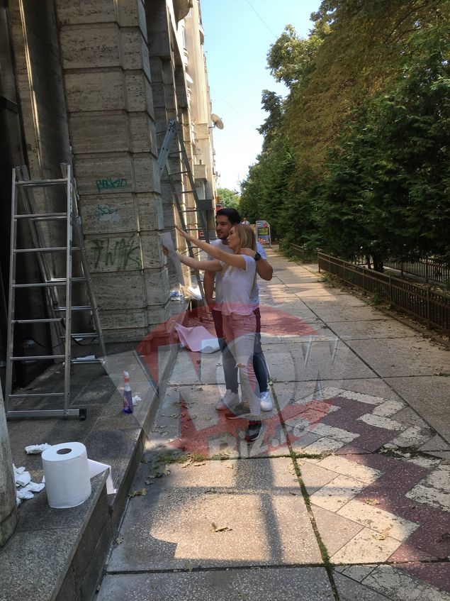 Desi aveau mult de munca, blondina si iubitul ei si-au facut timp si de cateva momente de tandrete. S-au imbratisat si s-au sarutat, cocotati pe scara!