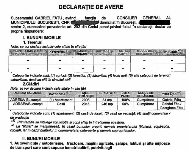 Gabriel Fatu mai detine un apartament in Bucuresti, de 54 mp cumparat in 2006, bijuterii si obiecte de arta de aproape 60.000 de euro, doua conturi in banci: unul de 70.000 de lei, iar celalalt de 21.400 euro, iar in 2015 a avut venituri cumulate de 51.000 lei si 54.000 de euro (salariu plus drepturi de autor) precum si dividende in valoare de 20.000 de euro la o societate comerciala.