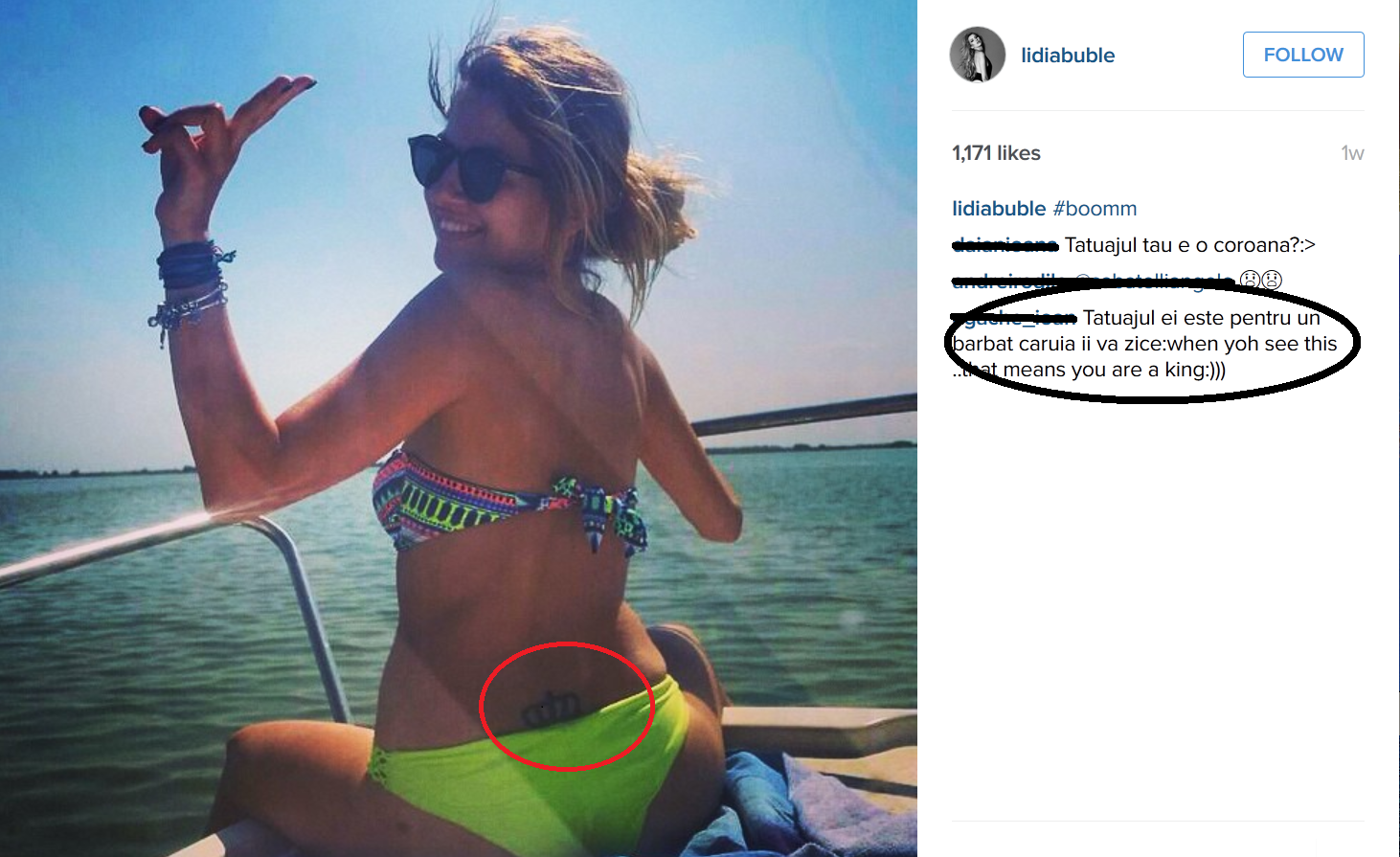De exemplu, cantareata si-a facut un tatuaj intim, special pentru Razvan. Deasupra fundului, blondina si-a tatuat o coroana. Intr-una din fotografiile postate de cantareata pe unul din site-urile de socializare, se poate observa mai bine de jumatate din desenul din zona intima. “Tatuajul ei este pentru un barbat caruia ii va spune: cand vei vedea asta inseamna ca esti regele”, i-a scris unul din fani.