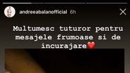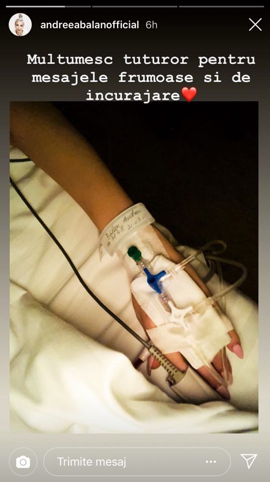 În urmă cu o seară, Andreea Bălan a ieșit din operație și s-a trezit din anestezie, astfel că a ținut să transmită un mesaj admiratorilor ei de pe rețelele de socializare, pentru a-i informa că totul este în regulă și se va reface treptat.
