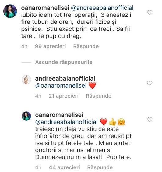 De asemenea, și Andreea Marin și Tavi Clonda i-au comentat artistei. De asemenea, soțul ei, George Burcea, a întâmpinat-o pe artista Andreea Bălan cu un trandafir pe patul de spital.
