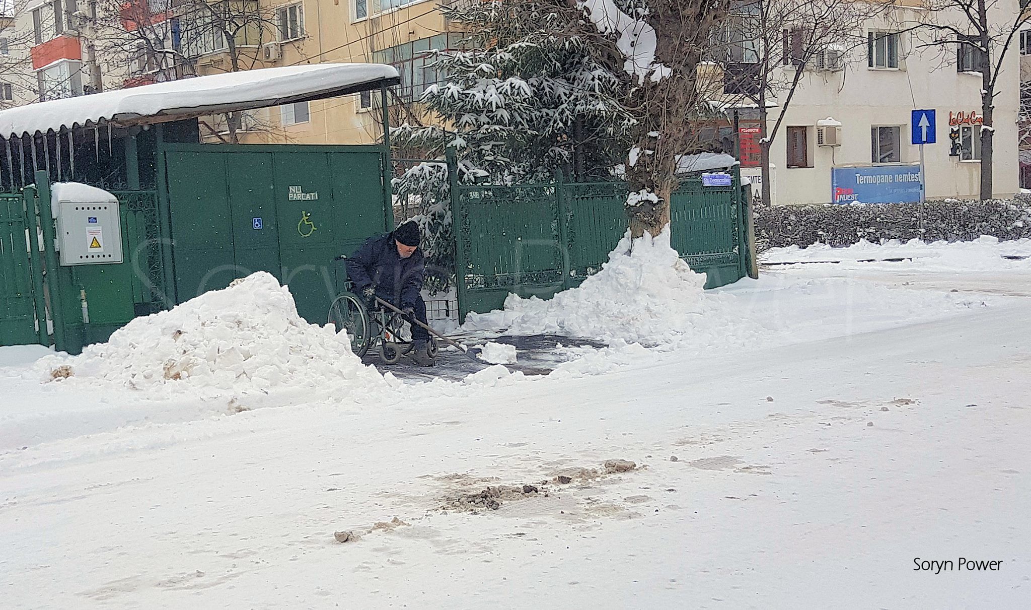 Imaginea infatiseaza un batran, in scaun cu rotile, ostovit de boala si de batranete si care se chinuie sa isi dea zapada la o parte din fata portii.