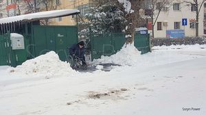Un trecator a surprins momentul in care batranul invalid arunca cu lopata zapada care fusese aruncata de plug.