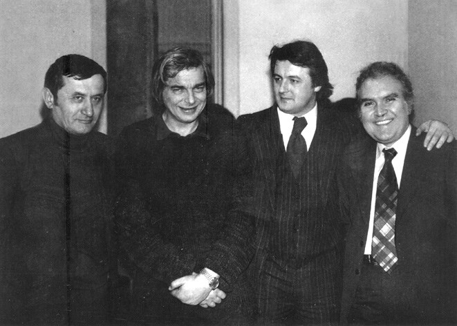 Privesc această fotografie-document. E o pagină de istorie a culturii. Doi poeţi, un compozitor şi un pictor. Eu sînt cel mai tînăr dintre ei. L-am iubit enorm pe Nichita Stănescu. Îl cunoscusem în 1974, la Casa Scriitorilor, de pe Calea Victoriei. Citisem o piesă de teatru, la Cenaclul de Dramaturgie, şi beneficiasem de elogiile unor oameni ca Dina Cocea, Ion Băieşu, Ion Zamfirescu ş.a. Numai Radu F. Alexandru m-a criticat. Asta nu ne-a împiedicat să devenim amici. Atunci, Nichita Stănescu – aflat în restaurantul de la parter – mi-a trimis un bilet, prin dramaturgul Dorel Dorian, în care mă încuraja şi îl făcea praf pe contestatar: „Vadim, am auzit că un jidan s-a luat de piesa ta” (sau cam aşa ceva). Efectiv, a scris acel cuvînt infamant. Dar, în gura sa, sub condeiul unui om minunat, care avea mulţi prieteni evrei (inclusiv Dorel Dorian), aşa ceva nu era peiorativ. Am pierdut acel bilet, aşa cum am pierdut şi poeziile pe care mi le-a dedicat autorul celor „11 elegii”. Le-am pierdut, mai mult ca sigur, cu prilejul atîtor schimbări de domiciliu. Ulterior, în 1976, m-am împrietenit, la toartă, cu Nichita Stănescu. Întîmplarea a făcut să bem bere, amîndoi, pe terasa Restaurantului Berlin, la două mese alăturate. Eu eram cu fotoreporterul Cioboată, iar el cu nişte prieteni. În toamna anului următor m-am pomenit că mi-a făcut o cronică elogioasă la volumul meu de debut, pe care a citit-o la Radio şi apoi a publicat-o în „Scînteia”. Nu voi uita, niciodată, generozitatea lui biblică. A fost un om extraordinar. El a marcat acea epocă literară prin creaţia lui, dar şi prin personalitatea copleşitoare. Pur şi simplu, el nu numai că sfinţea locul, ci îl şi lumina cu o aureolă de raze. La începutul anilor ’90, nişte nelegiuiţi l-au acuzat că ar fi colaborat cu Securitatea (?!). Atunci, mama şi sora poetului mi-au trimis, mie, o scrisoare de protest – am citit-o de la tribuna Senatului şi am publicat-o, pe pagina 1, a „României Mari”. Pe urmă, încet-încet, s-au prăpădit şi ele, ducîndu-se după Zeul lor. Ce e viaţa!