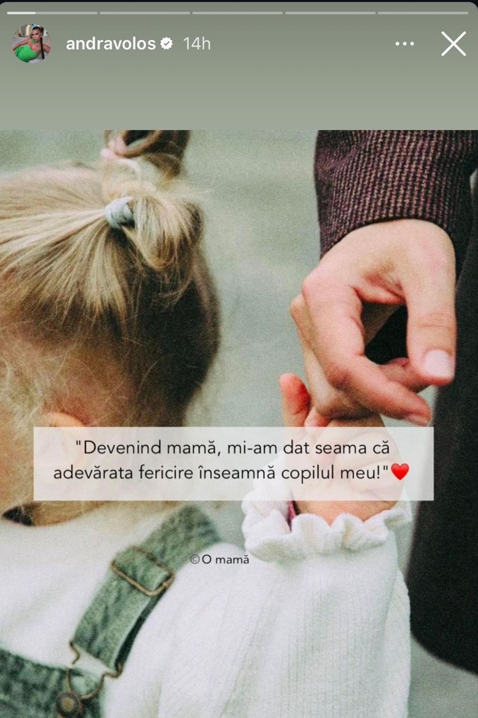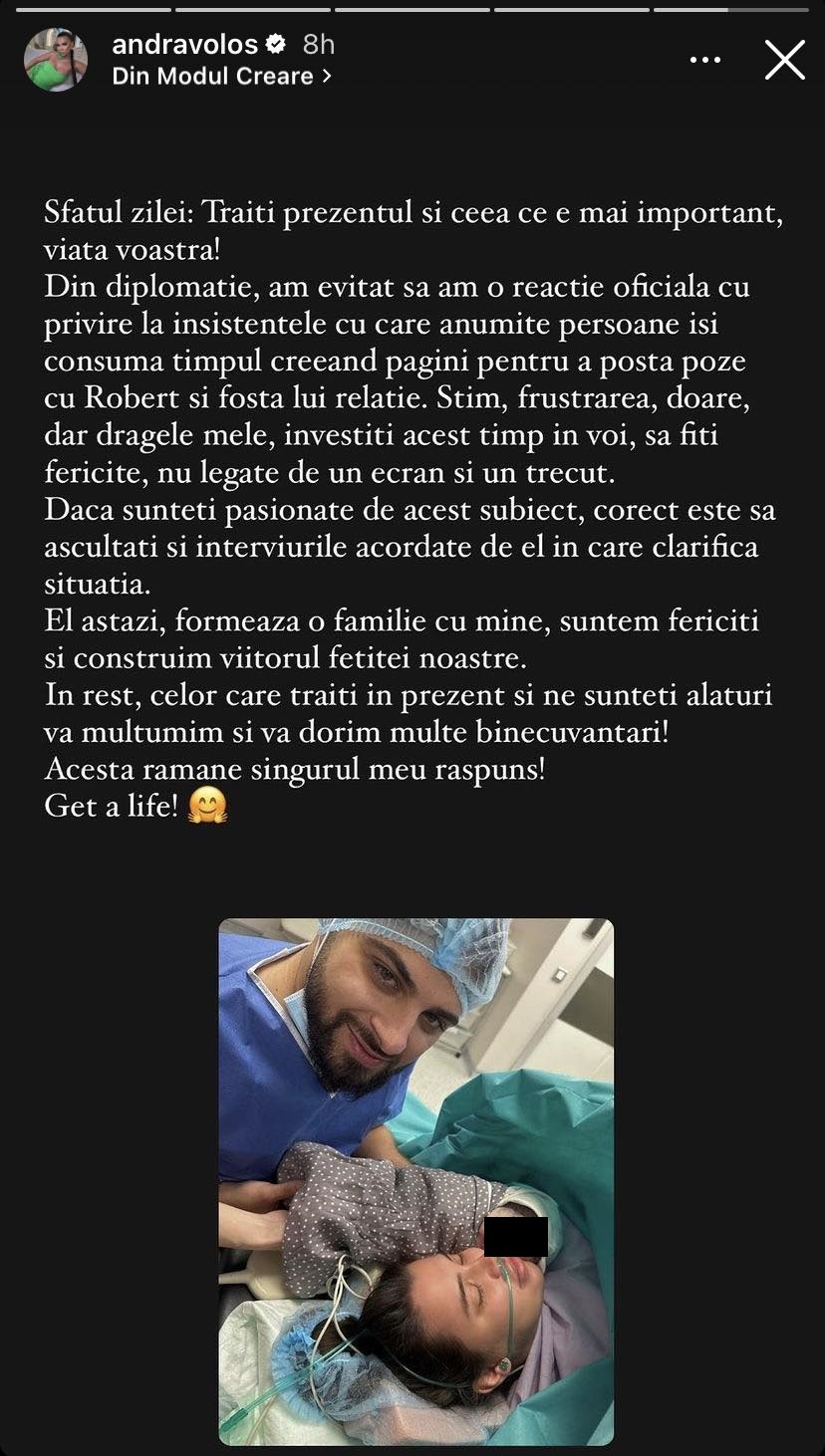 „Sfatul zilei: Trăiți prezentul și ceea ce e mai important, viața voastră! Din diplomație, am evitat să am o reacție oficială cu privire la insistențele cu care anumite persoane își consumă timpul creând pagini pentru a posta poze cu Robert și fosta lui relație. Știm, frustrarea doare, dar dragile mele, investiți acest timp în voi, să fiți fericite, nu legate de un ecran și un trecut. Dacă sunteți pasionate de acest subiect, corect este să ascultați și interviurile acordate de el în care clarifica situația. El, astăzi, formează o familie cu mine, suntem fericiți și construim viitorul fetiței noastre. În rest, celor care trăiți în prezent și ne sunteți alături, vă mulțumim și vă dorim multe binecuvântări. Acesta rămâne singurul meu răspuns. Get a Life!”, a scris Andra Volos, pe pagina ei de Instagram.