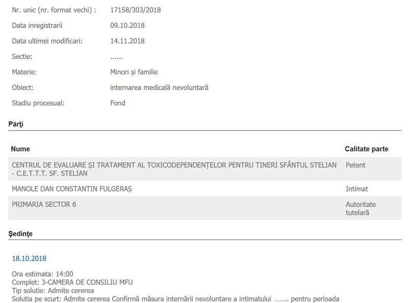 ” Admite cererea Confirmă măsura internării nevoluntare a intimatului pentru perioada 27.09.2018-17.10.2018. Constată încetarea condiţiilor ce au impus internarea nevoluntară, la data de 17.10.2018 Cheltuielile judiciare reprezentând onorariul avocatului din oficiu în sumă de 260 lei, avansate din fondul Ministerului Justiţiei, rămân în sarcina statului. Cu recurs în 3 zile de la comunicare; cererea de recurs se depune la Judecătoria Sector 6 Bucureşti. Pronunţată în şedinţă publică, azi, 18.10.2018”, se arată în decizia Judecătoriei Sectorului 6, conform portal.just.ro.