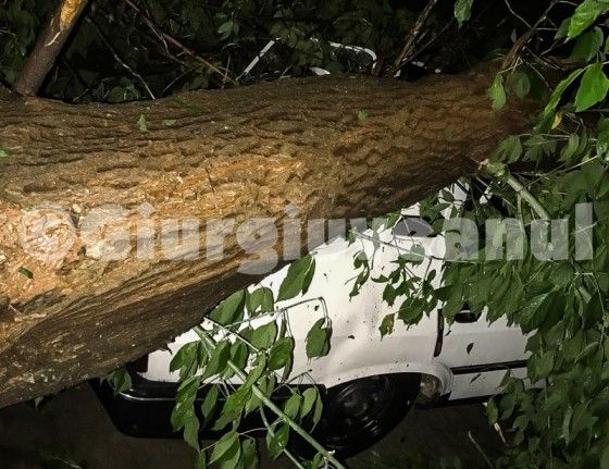 Un autoturism, aflat în parcarea de la PSD, pe pietonala din centru, a fost avariat complet de un copac căzut pe plafon.