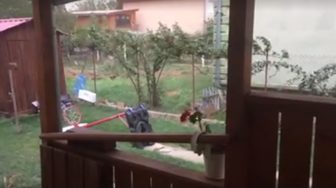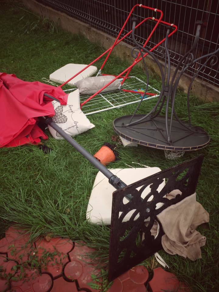 Mesele, scaunele, uscatorul de rufe si alte lucruri au fost luate pe sus de vant, iar florile