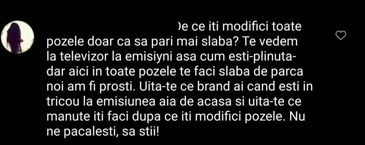 ”Vaii vai ce pedichiura ,marea vedeta si unghiile praf!!Rusineeee/ Data viitoare incearca sa nu expuii si peretele din stanga ta…se vede murdar unde se termina mocheta…/ Fix pana la buric ii vin sanii!! O fi asa greu sa.si puna un sutien bun?? 🤔/ Păcat de trening, pedichiura….e jalnica/ Nu sunt rea ,dar la cum este o persoana publica trebuie sa fie nai atenta!!Zic la cata publicitate face!/ Scuze dar mai cu atentie ,sau mai bn zis fara expunere daca nu suntem ingrijite!!!/ Doar eu am intrat sa citesc comentariile despre pedichiura?😂/ Oja diferită. Urât. Picioare mari, cu degetele cât alea de la mâini. Urâte. Astea se văd primele. Treningul e trening”, au fost doar câteva reacții de pe internet.