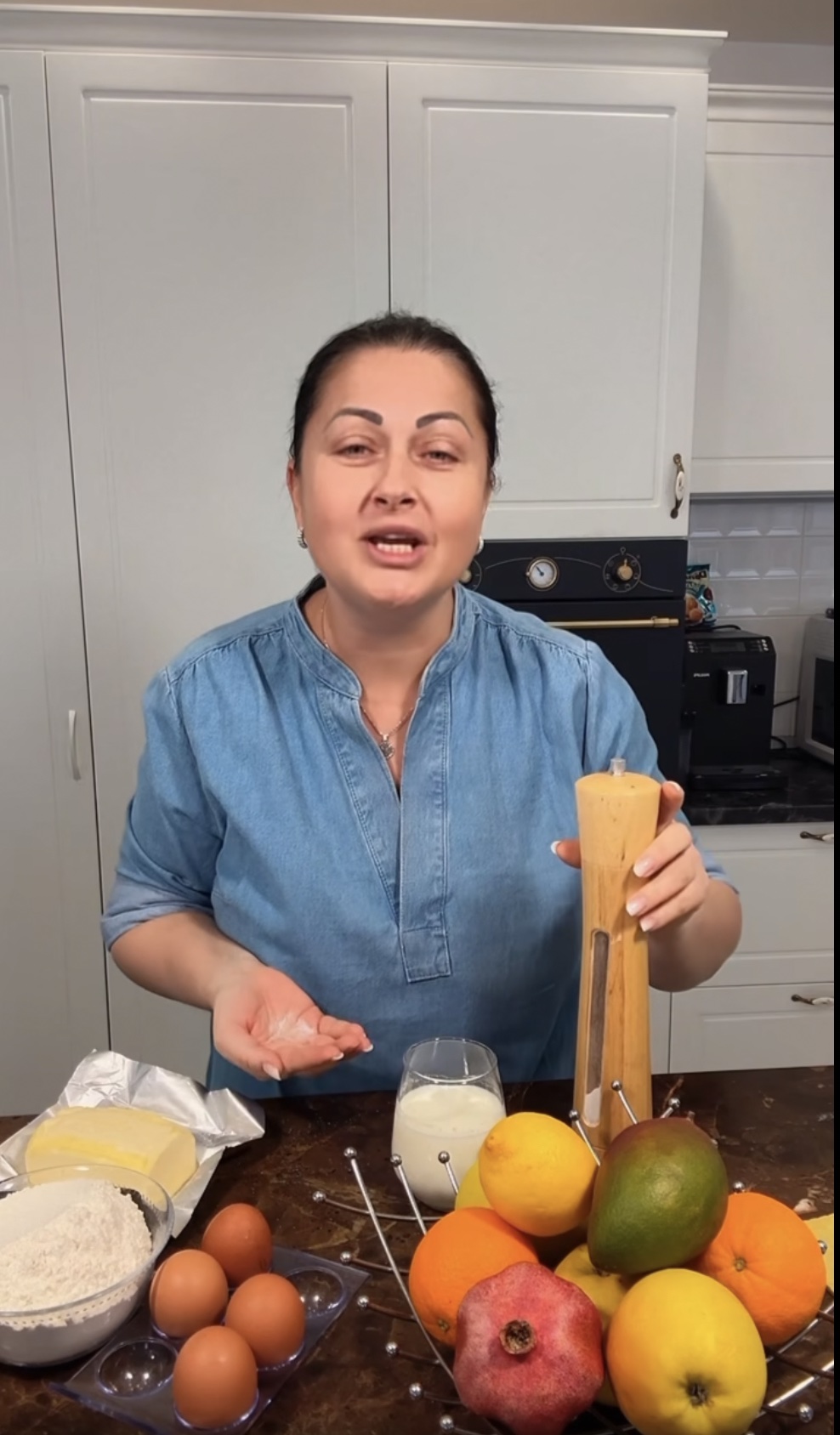 „Astăzi am să fiu super cinstită cu voi și am să vă povestesc despre praful pe care îl folosesc în bucătărie. Șoc și groază! Praful pe care eu îl folosesc bucătărie este... praful de sare! Praful de sare, atât de necesar în bucătărie atunci când gătim produse sărate, dar și pe cele dulci, pentru că da, este important să punem sare în preparatele dulci, pentru că sarea desface aromele. La mine în bucătărie până și praful de sare este magie, pentru că eu folosesc sare roz de Himalaya. V-o recomand s-o folosiți și voi, este de cea mai bună calitate. Produsele pe care eu le folosesc acasă la mine, pentru familia mea, sunt de cea mai înaltă calitate. Ouăle sunt din sursă sigură, făina mea are un indice proteic de 15%, laptele nu are niciodată mai mult de 3,5% grăsime, iar untul are undeva la 80% grăsime. În felul acesta, aluaturile mele cresc și sunt extrem de elastice și extrem de ușor de modelat, iar la final cozonacii mei se desfac în pale, pale. La fel procedez și aceleiași produse și la Fărâma, brandul pe care l-am creat împreună cu familia mea cu dragoste și cu bucurie, pentru că știu, avem doi copii acasă și ne-am dorit ca ei să mănânce sănătos și produse de cea mai înaltă calitate. La fel am procedat și la Fărâma, și toate produsele care vor veni către voi vor fi unele care să satisfacă și pe cei mai pretențioși dintre voi. De săptămână viitoare, începem să livrăm cozonacii către voi, așa cum ați dori și așa cum ați comandat.