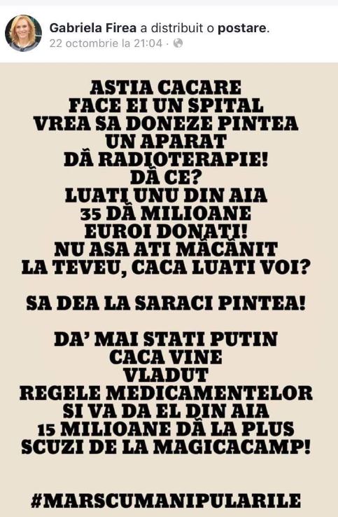 Dar când Gabriela Firea, primarul Bucureștiului, omul care gestionează bugetul și resursele celui mai mare oraș din țară, share-uiește așa ceva, defecând pe implicarea și susținerea a peste 260.000