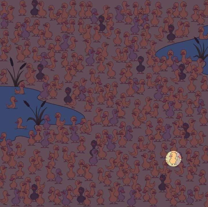 Deși poate părea un test extrem de ușor, mulți dintre cei care au încercat să îl rezolve au dat greș și doar 1% dintre ei au ajuns la rezultatul corect. Pentru a găsi puiul de găină ce se ascunde printre rațele de culoare galbenă, dar și gri, trebuie să fii foarte atent și să analizezi în detaliu fiecare părticică a fotografiei.