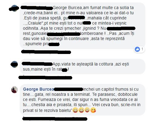 De altfel, înhămat la o muncă titanică, George Burcea a încercat să le răspundă tuturor, cu ironii fine, dar, la un moment dat, a cedat și l-a făcut praf pe unul dintre cei care îl jigniseră. ”Închei aici un capitol frumos și cu tine... gata, relația noastră s-a terminat. Te părăsesc, dobitocule ce ești. Fumează ce vrei, dar sigur n-aș fuma vreodată ce ai tu... Chestia aia e proastă, îți spun... Vrei ceva bun, scrie-mi în privat și te rezolvă băietu`”, a scris George Burcea, punând astfel punct controverselor cu privire la postarea Iuliei Albu.Andreea Bălan a suferit un stop cardio-respirator, acum câteva săptămâni, în timp ce medicii o supuneau unei operații de cezariană. Din fericire, starea ei a fost stabilizată, iar artista se recuperează acum după ce a adus pe lume cea de-a doua fetiță. Vestea că Andreea Bălan a suferit un stop cardio-respirator i-a alarmat pe fani, iar mulți dintre ei și-au reamintit declarațiile artistei chiar înainte de a naște.