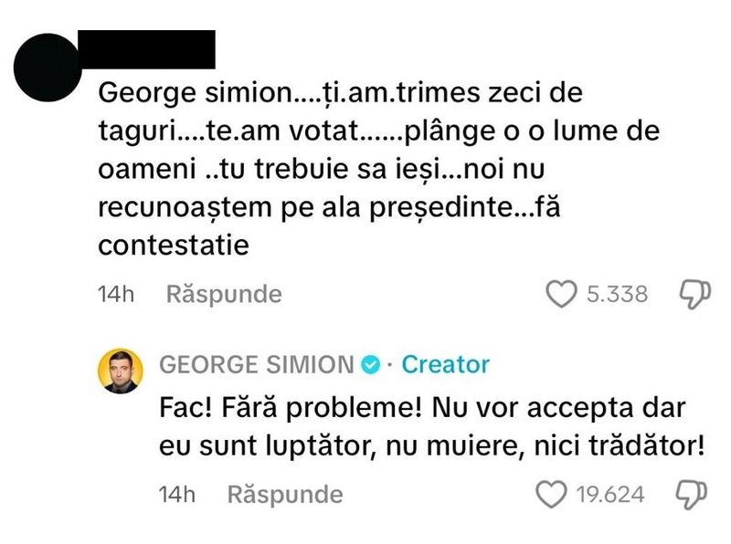 „George Simion, ți-am trimis zeci de tag-uri, te-am votat. Plânge o lume de oameni, tu trebuie să ieși, noi nu recunoaștem pe ăla președinte. Fă contestație”, i-a scris un internaut lui George Simion, pe TikTok.