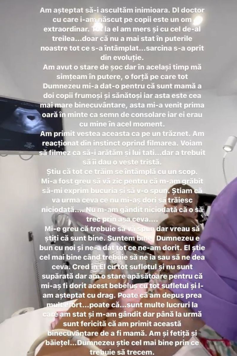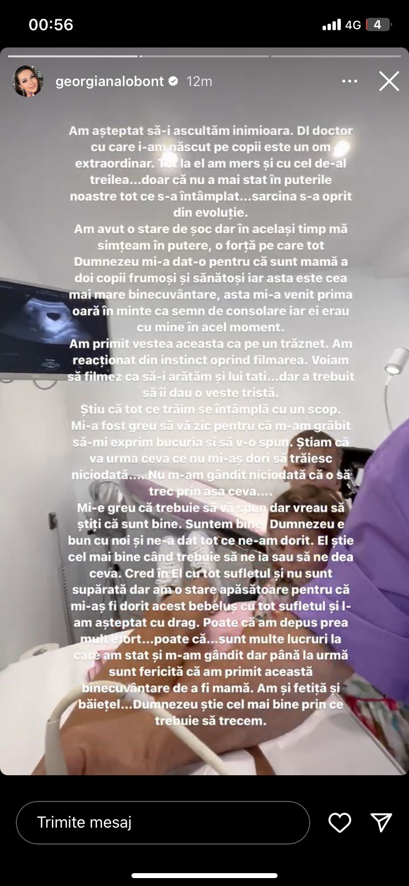 Mi-e greu că trebuie să vă spun dar vreau să știți că sunt bine. Suntem bine, Dumnezeu e bun cu noi și ne-a dat tot ce ne-am dorit. El știe cel mai bine când trebuie să ne ia sau să ne dea ceva. Cred în El cu tot sufletul și nu sunt supărată, dar am o stare apăsătoare pentru că mi-aș fi dorit acest bebeluș cu tot sufletul și l-am așteptat cu drag. Poate că am depus prea mult efort… poate că… sunt multe lucruri la care am stat și m-am gândit dar până la urmă sunt fericită că am primit această binecuvântare de a fi mamă. Am și fetiță și băiețel, Dumnezeu știe cel mai bine prin ce trebuie să trecem.”, a fost mesajul pe care l-a transmis Georgiana Lobonț fanilor din mediul online.