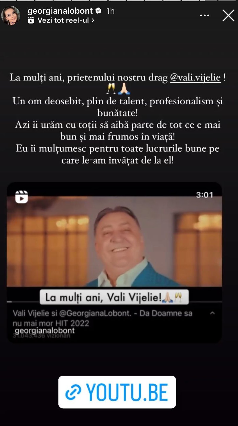 „La mulți ani, prietenul nostru drag, Vali Vijelie! Un om deosebit, plin de talent, profesionalism și bunătate! Azi îi urăm cu toții să aibă parte de tot ce e mai bun și mai frumos în viață! Eu îi mulțumesc pentru toate lucrurile bune pe care le-am învățat de la el!”, a scris Georgina Lobonț în mediul online, pentru Vali Vijelie.