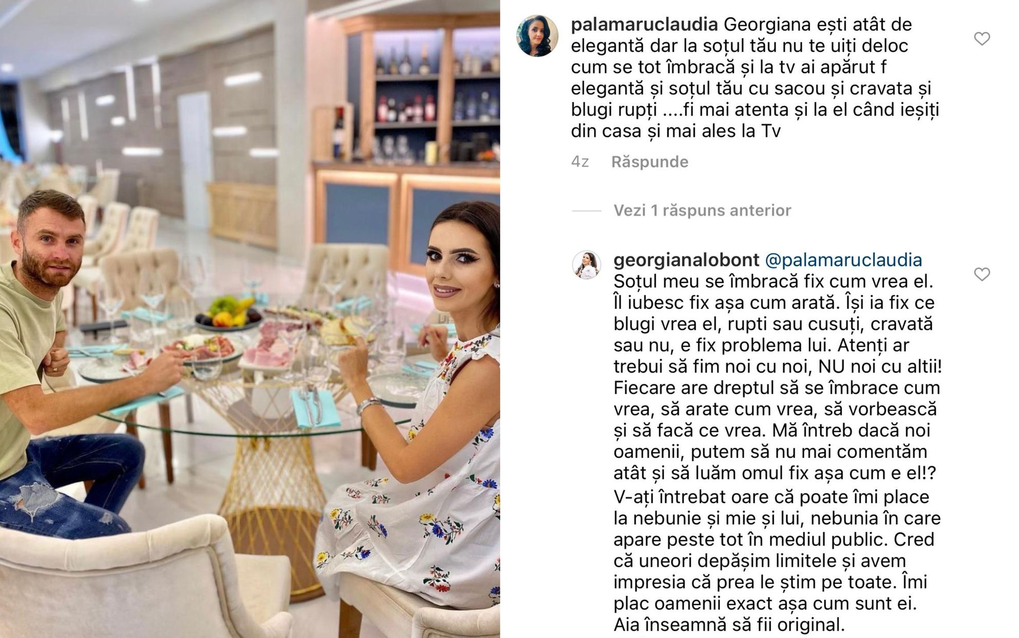 Georgiana Lobont, nu s-a putut abține să nu-i dea replica persoanei care a criticat dur stilul vestimentar al soțului ei, Rareș Ciciovan.