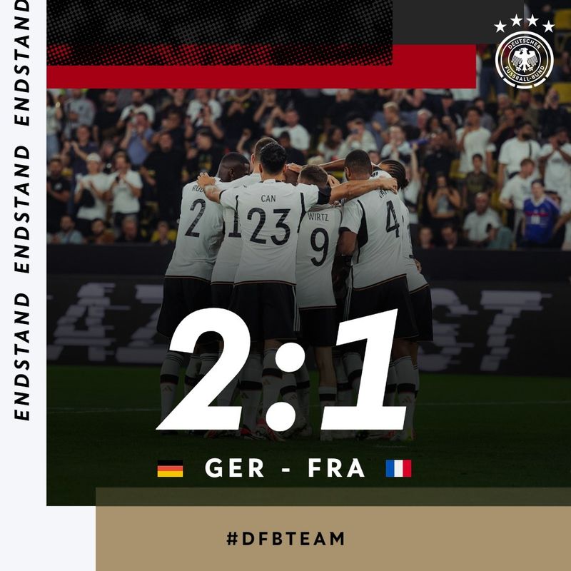 Naționala Germaniei a reușit să învingă marți, 12 septembrie, la Dortmund, cu scorul de 2-1, selecționata Franței, acesta reprezentând primul eșec din acest an al vicecampioanei mondiale.