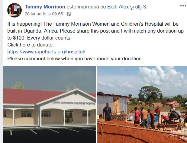 Proiectul ”The Tammy Morrison Women & Children’s Hospital” aparține unui ONG din Uganda numit RHF (Rape Hurts Foudation), apărut ca urmare a faptului că în estul Ugandei se înregistrează peste 2.000 de cazuri de agresiuni sexuale sau violență domestică pe an. Conform organizației, 65% dintre cazuri necesită intervenție medicală urgentă iar sistemul medical din Uganda este deficitar la acest capitol.