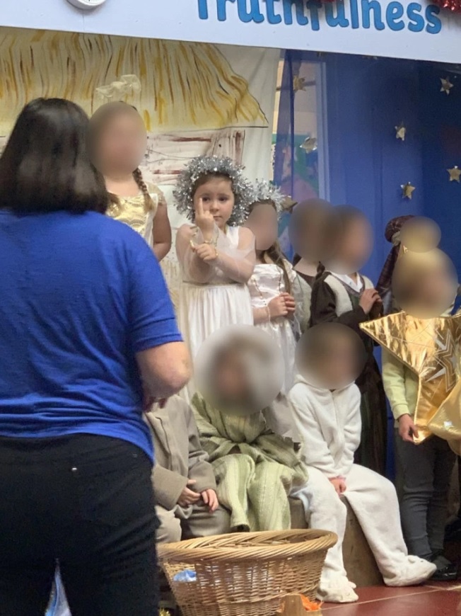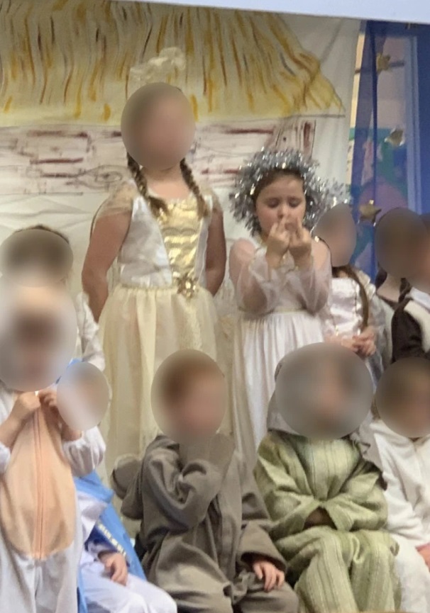 Micuța Ella Legge, în vârstă de 5 ani, a arătat, timp de 20 de minute, degetul mijlociu, tuturor persoanelor care priveau scena nașterii, piesa în care juca rolul unui înger.