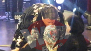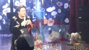 “Mamaie, va multumesc frumos! Noi facem anul acesta 10 ani de cand eu cant prin tara, in turnee. Adica aniversam 10 ani de turnee nationale, iar dumneata esti din primul an cu cozonacii la purtator. Va iubesc din tot sufletul pentru ca dumneavostra faceti cei mai buni cozonaci din lumea asta! Eu am mancat cozonaci peste tot in lume, si in strainatate si aici, dar cozonacii dumitale sunt facuti cu suflet, sunt facuti cu toata dragostea. D-asta trebuie sa va spun ca eu si echipa mea, cand venim la Iasi, ne ingrasam 2 kilograme din cauza cozonacilor dumitale. Mamaie, nu te-am intrebat niciodata, ce varsta ai? 85 de ani, sa fiti sanatoasa! Saru’mana! Vreau sa va sarut pe frunte. Sa fiti sanatoasa, eu va sarut si va iubesc!”, i-a spus Fuego bunicutei. Artistul a ingenunchiat pe scena, s-a aplecat si a sarutat fruntea batranei.