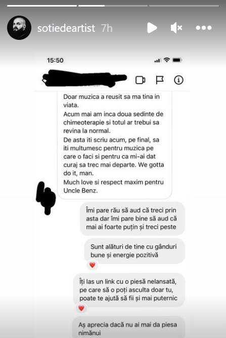 Am doar 21 de ani și încă am tot viitorul înainte, dar lucrurile și gândurile pe care le-am avut de când cu boala asta m-au turmentat. Doar muzica a reușit să mă țină în viață. Acum mai am încă două ședințe de chimioterapie și totul ar trebui să revină la normal. De asta îți scriu acum, pe final, să îți mulțumesc pentru muzica pe care o faci și pentru că mi-ai dat curaj să trec mai departe."