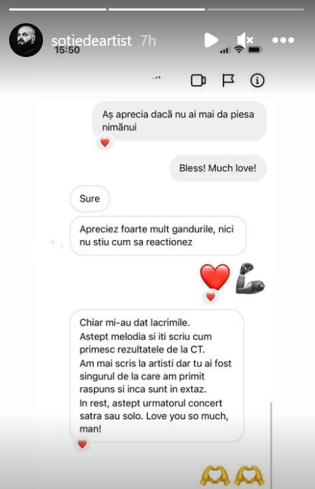 "Chiar mi-au dat lacrimile. Aștept melodia și îți scriu cum primesc rezultatele de la CT. Am mai scris și la alți artiști, dar tu ești singurul de la care am primit răspuns și încă sunt în extaz. În rest, aștept următorul concert Șatra sau solo. Te iubesc mult, omule!", i-a spus tânărul lui Nosfe, impresionat de gestul pe care artistul l-a făcut pentru el.