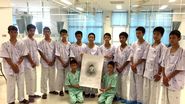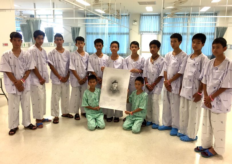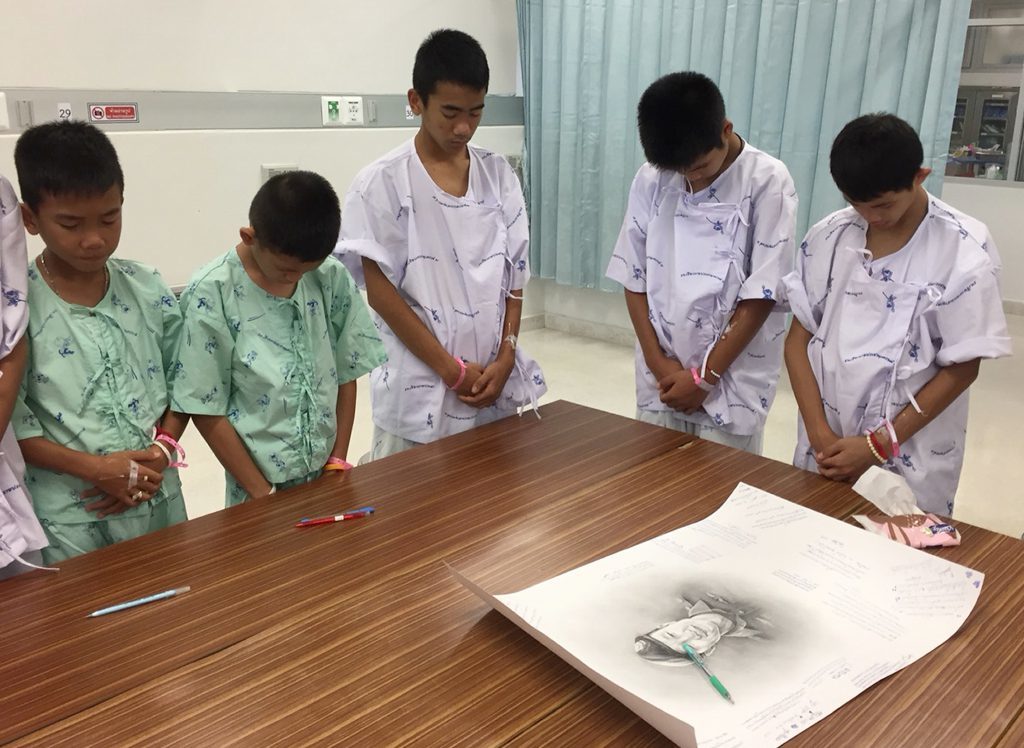 In imaginile suprinse de autorităţile thailandeze, echipa de fotbal "Wild Boars”, aflata in continuarea sub supraveghere medicala, sta adunata, solemn, in jurul unei imagini a scafandrului.