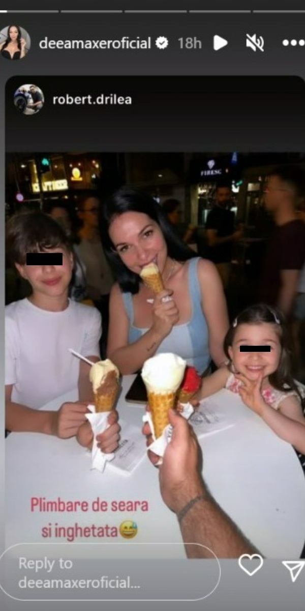 „Plimbare de seară și înghețată”, a scris Robert Drilea, în dreptul imaginii cu Deea Maxer și copiii ei.