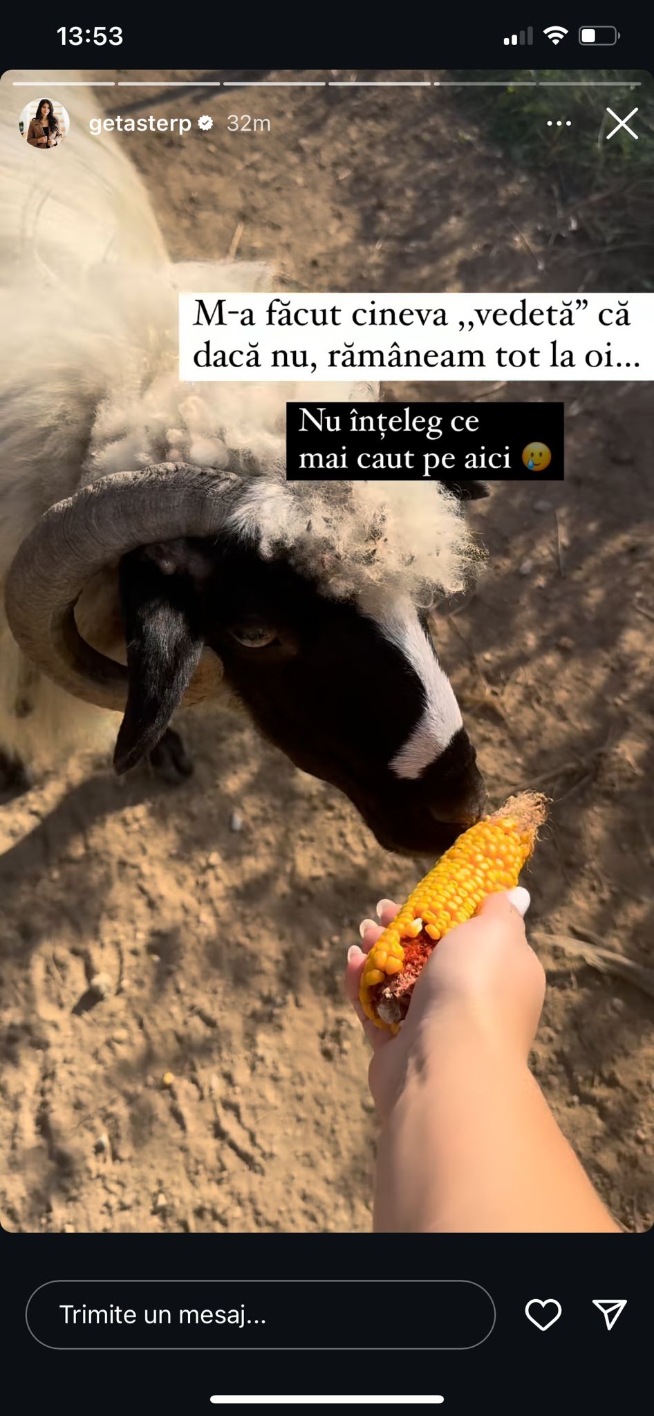 „M-a făcut cineva „vedetă” că, dacă nu, rămâneam tot la oi. Nu înțeleg ce mai caut pe aici”, este mesajul transmis de Geta Sterp pe Instagram.