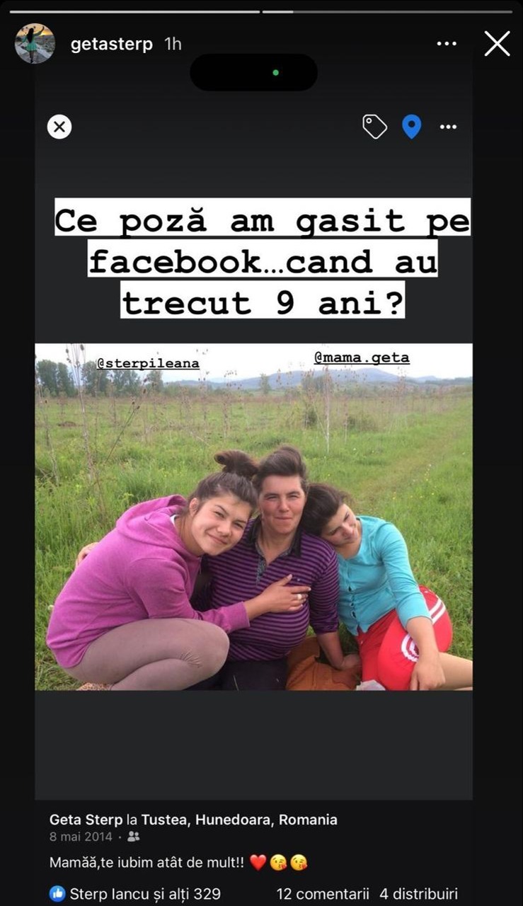 Getuța se emoționează de fiecare dată când când vine vorba despre familia sa. Și-a ajutat mama de mică la treburile gospodărești, însă nici acum, chiar dacă s-a așezat la casa ei, nu ezită să-i ofere o mână de ajutor la nevoie. Recent, sora cea mică din familia Sterp a dat peste o fotografie veche în care se afla cu mama Geta și Ileana, de acum 9 ani.