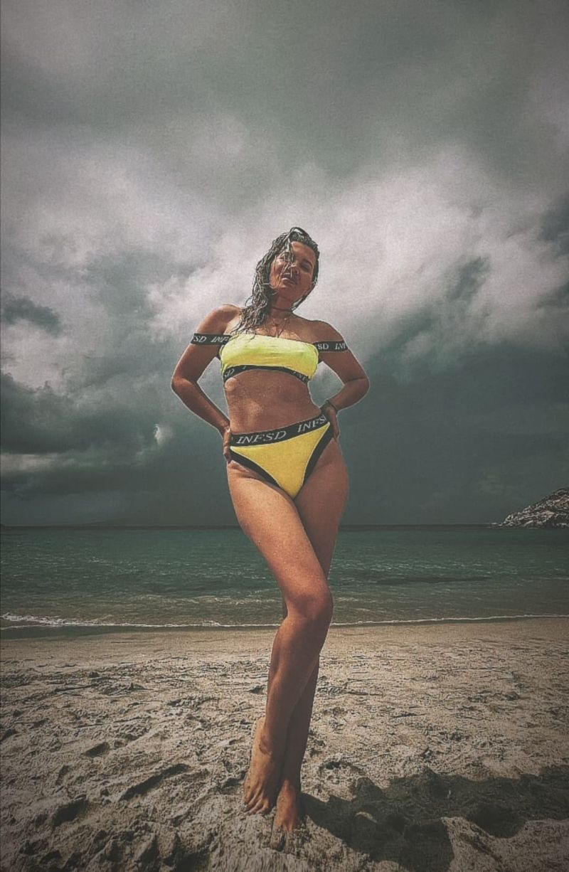 Blonda a renunțat la haine și a optat să poarte doar un costum de baie din două piese, o combinație de galben cu negru ca și culoare și a pozat exact ca pe vremuri. Dezinvoltă, mândră și liniștită, semn că viața de mamă îi priește, dar și că se simte bine în pielea ei.