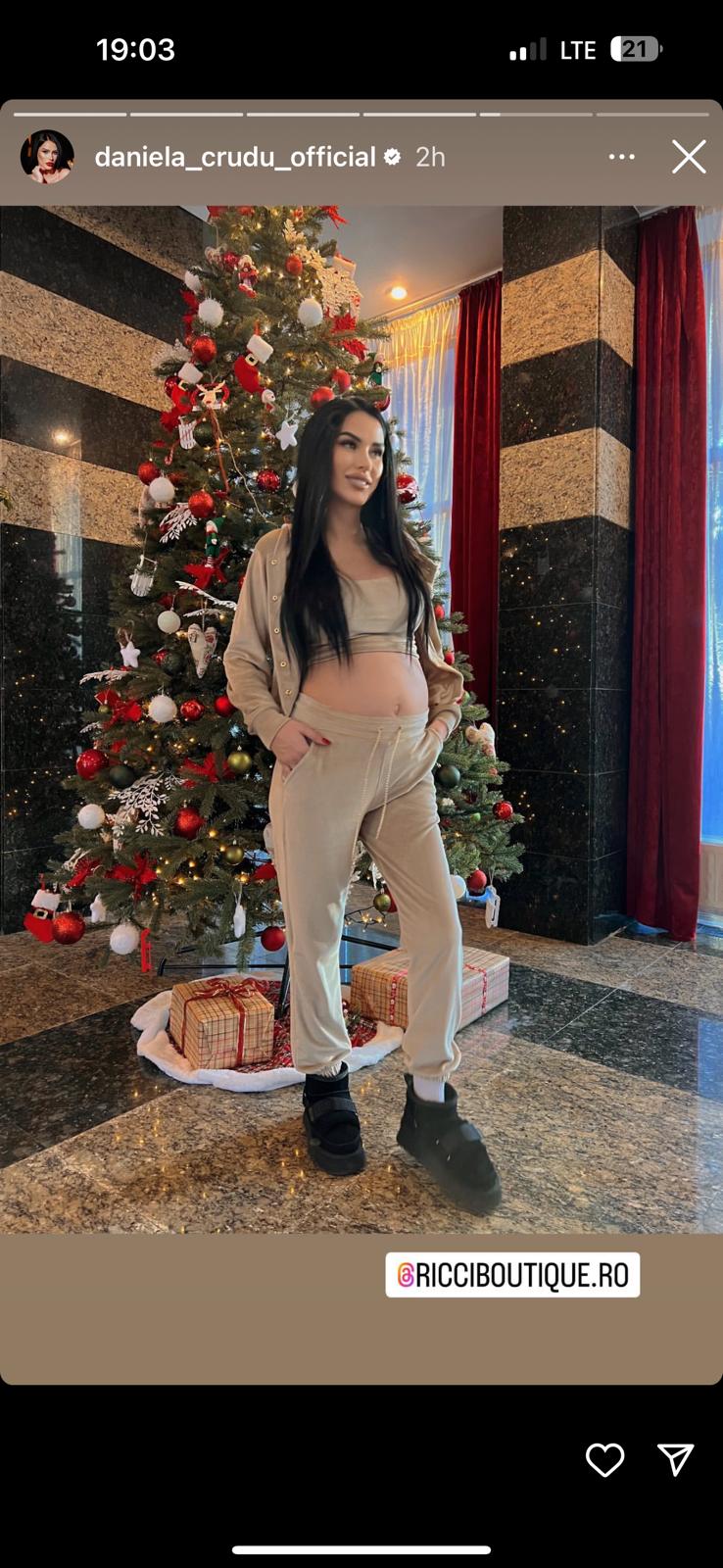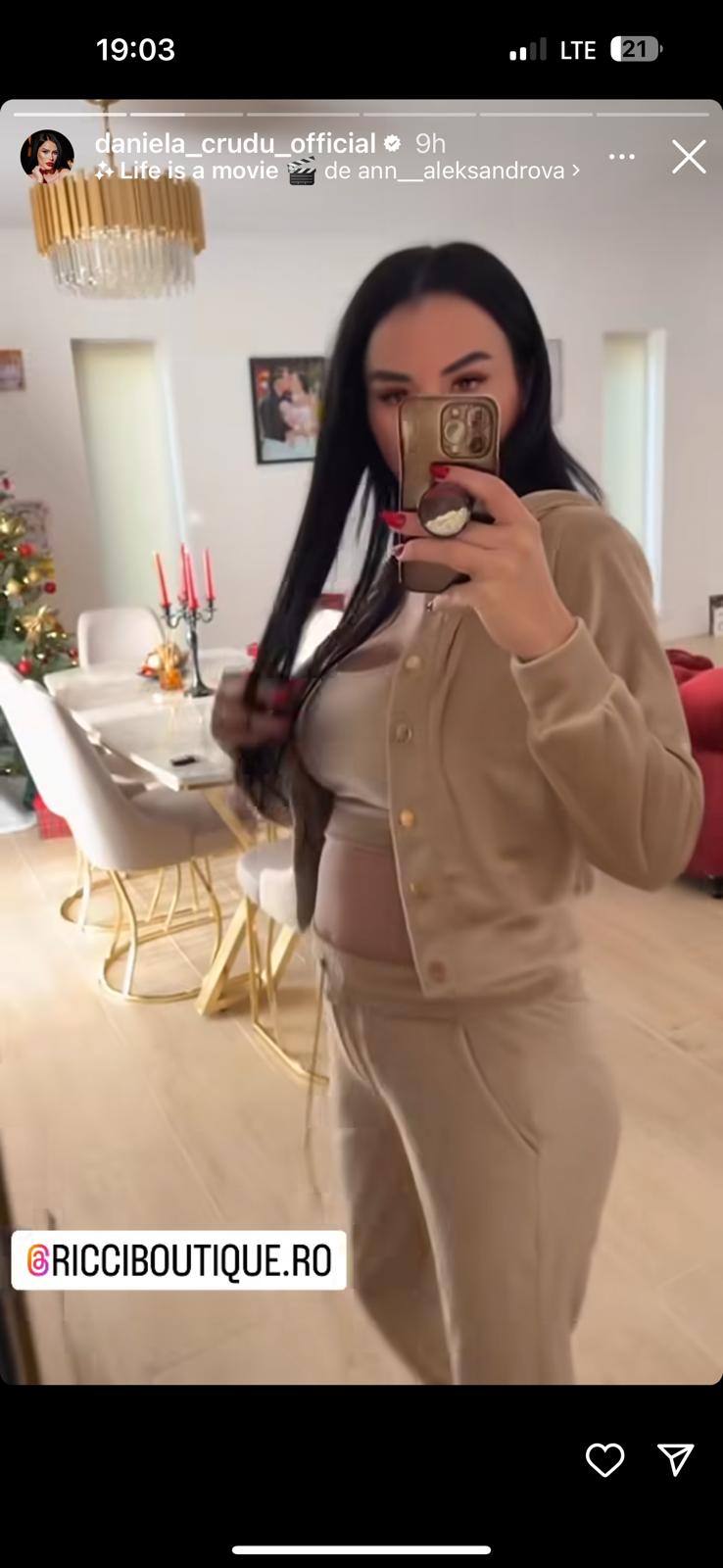 „Graviduța superbă Daniela Crudu poartă treningul nostru din catifea”, se arată în postarea făcută de firma de haine, unde Daniela Crudu este model.
