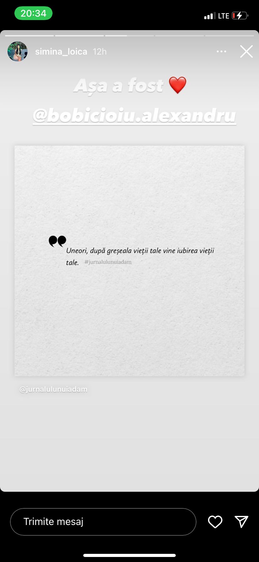 Alex Bobicioiu nu a rămas indiferent în fața unei asemenea declarații de dragoste. Tânărul a repostat mesajul pe profilul personal de Instagram, acolo unde a lăsat și un mesaj, moment în care a confirmat ceea ce a spus iubita sa.