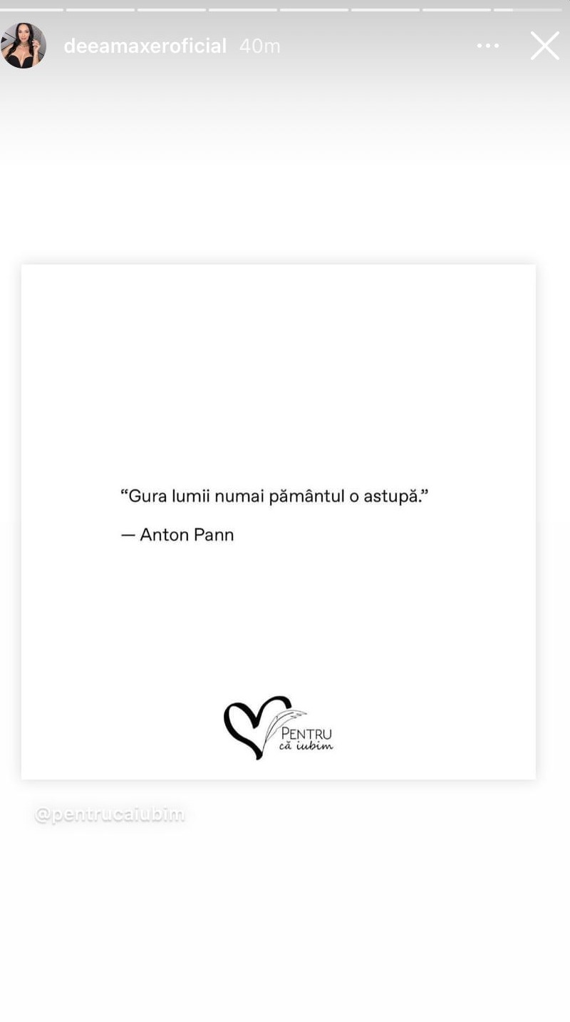 După ce Deea Maxer a făcut public anunțul cu totul neașteptat al divorțului de Dinu, mai multe vedete și-au dat cu părerea despre această situație, având în vedere că cei doi foști soți s-au afișat de fiecare dată ca fiind cuplul perfect. Printre aceste persoane publice se numără Gabriela Cristea și Mara Bănică, care, la fel ca fanii fostului cuplu, au rămas surprinse de decizia pe care cei doi au luat-o. La distanță de o zi față de opiniile celor două vedete, Deea, încă suferindă și cu moralul la pământ, a postat în mediul online un mesaj prin care a lăsat să se înțeleagă că este dedicat special pentru toți cei care au comentat