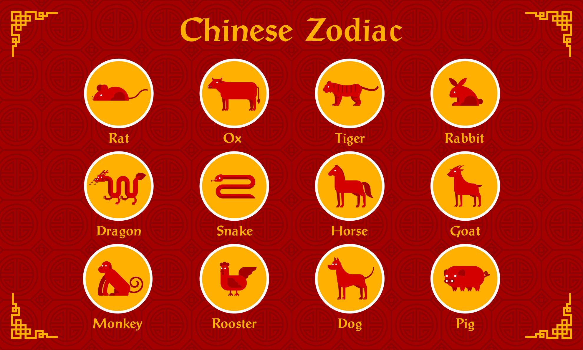 Zodiacul chinezesc este format din 12 semne, respectiv 12 animale, care potrivit  tradiției chineze, s-au prezentat la adunarea convocată de Buddha pentru a-și lua rămas bun.