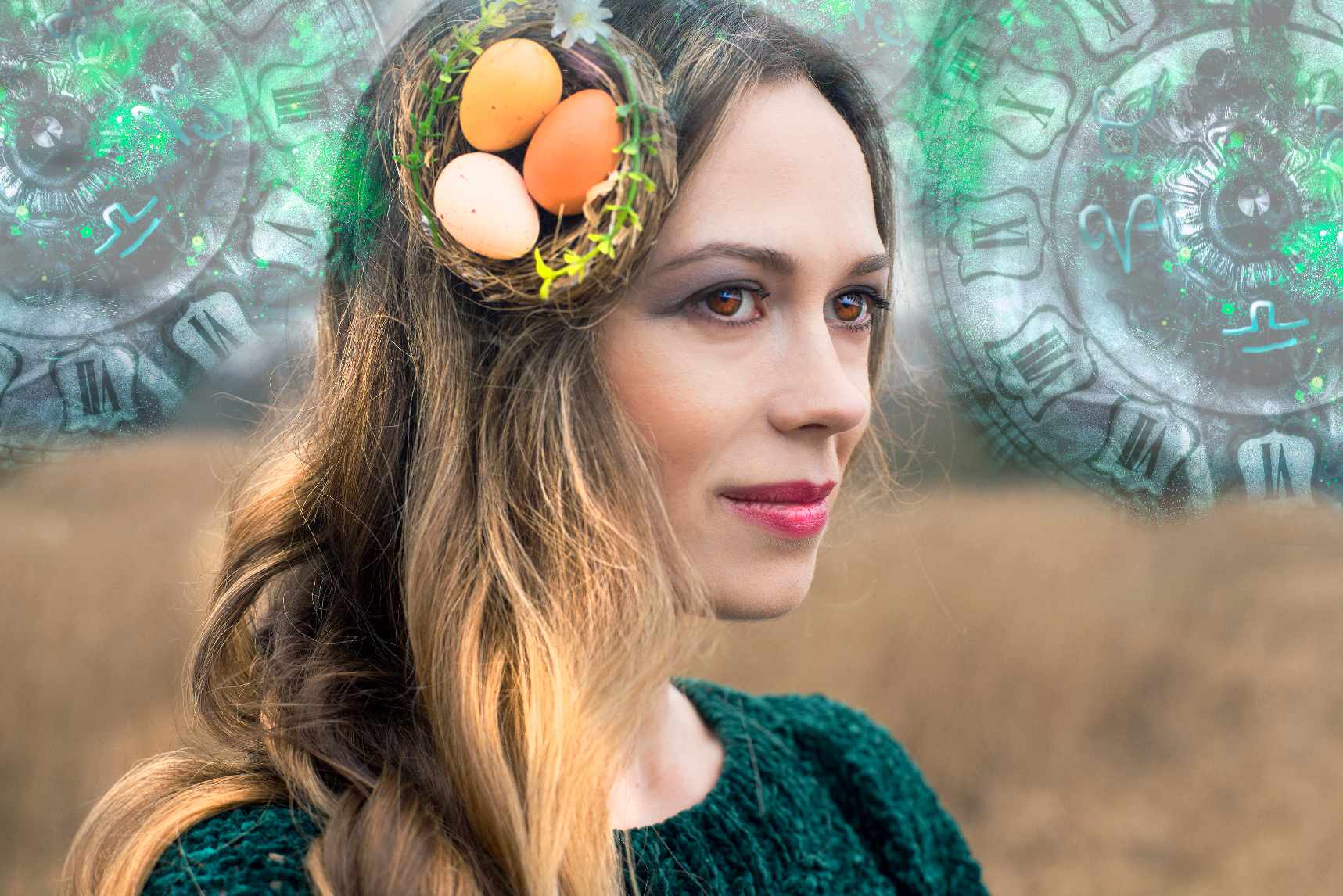 Femeie cu ouă de Paște în păr