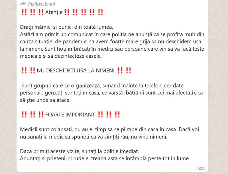 Astăzi am primit un comunicat în care politia ne anunță că se profita mult din cauza situației de pandemie, sa avem foarte mare grija sa nu deschidem ușa la nimeni. Sunt hoți îmbrăcați în medici sau persoane care vin sa va facă teste medicale și sa dezinfecteze casele.