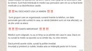 Un mesaj alarmist care s-a propagat prin intermediul aplicațiilor de socializare a fost demontat astăzi de Poliția Română. În acest text, populația este avertizată că există grupări de infractori care se recomadă drept medici și, în contextul epidemiei de coronavirus, încearcă să pătrundă în locuințele oamenilor sau să le solicite date personale.
