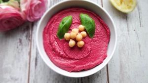Pentru micul dejun, iti propunem o reteta delicioasa de humus din naut cu sfecla rosie.