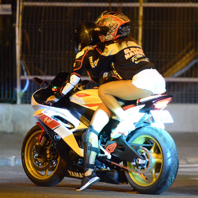 Fosta prezentatoare meteo a vrut sa simta adrenalina oferita de plimbarea pe motocicleta la ceas tarziu in noapte, desi pantalonii scurti pe care i-a purtat nu aveau nici o legatura cu costumul standard de biker.